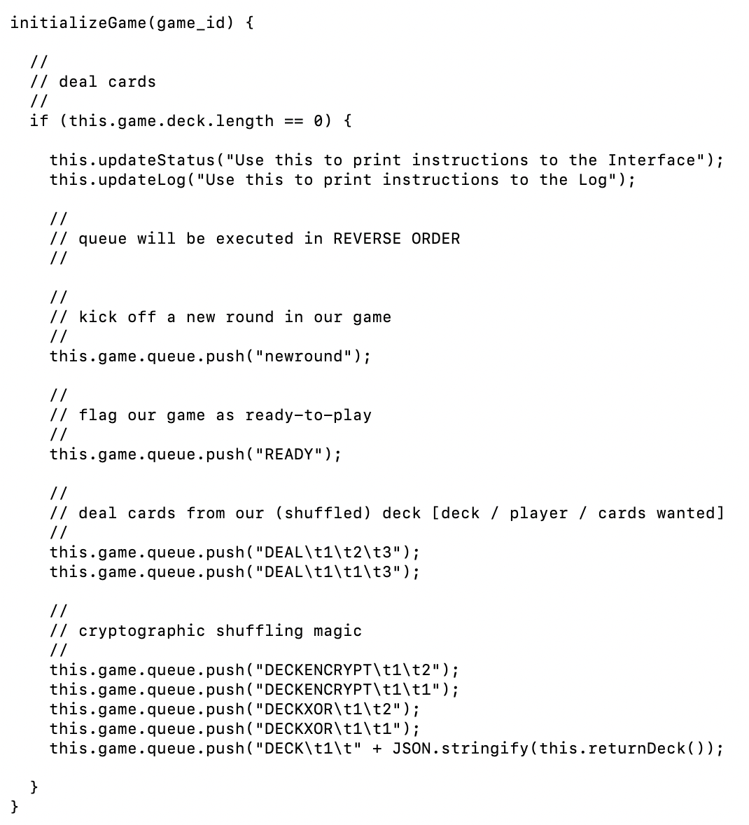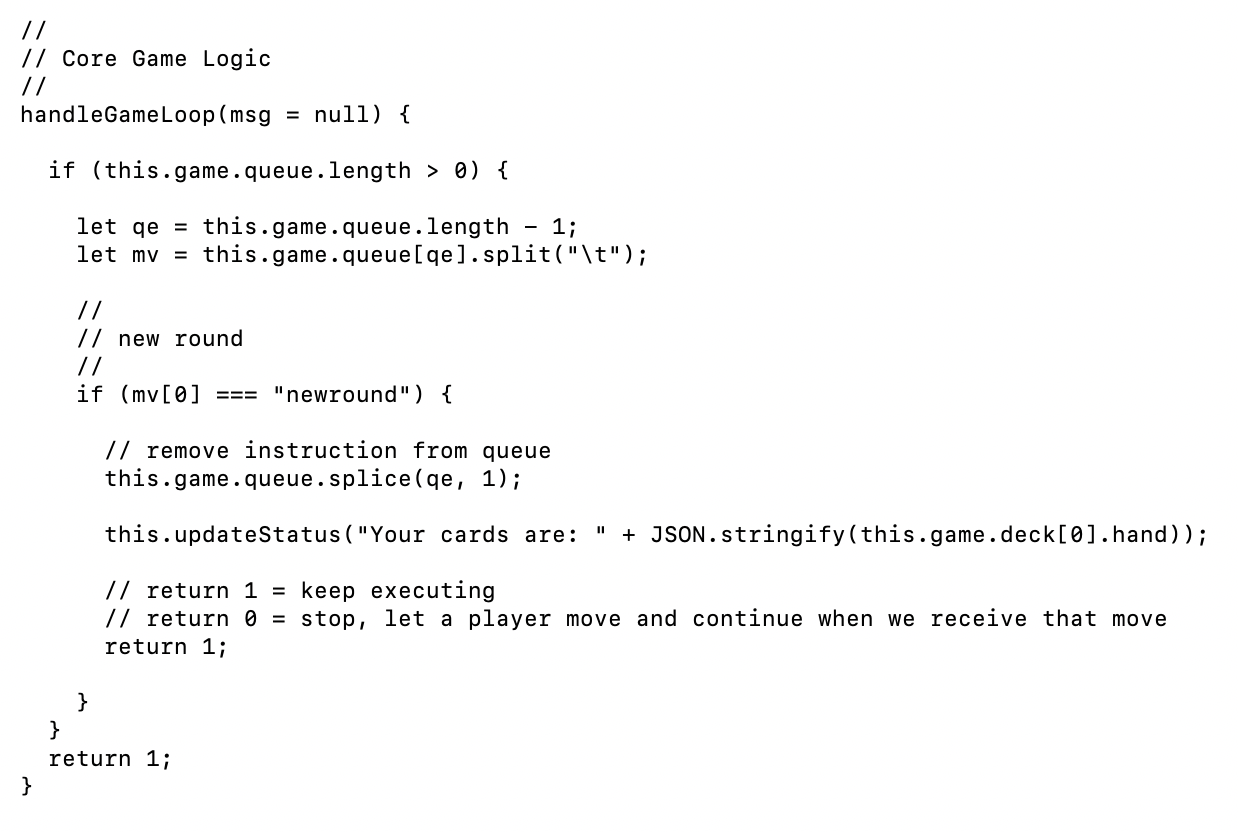 The version of this function included in the final tutorial is fleshed out a bit, but the version above should make it clear what is happening. [this.game.queue] has its instructions processed one-by-one. Games work by adding content to the queue and then removing them and updating the state. The important thing to note is the return value. If this function returns 1 then the game engine will continue to process the next move. If the function returns 0 it will wait for the next move to arrive over the network (from another player, or possibly broadcast by its own player).