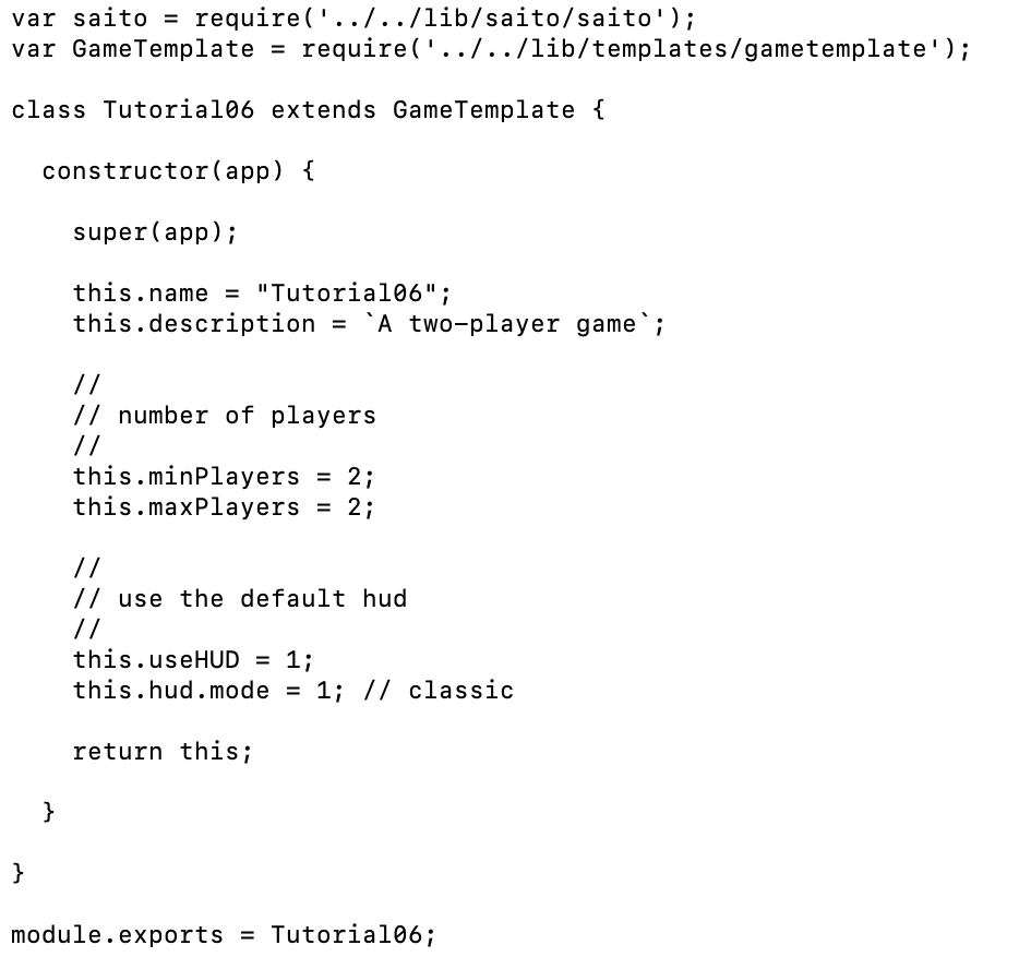 Create your application directory as usual. Instead of extending your module from the ModTemplate class, extend it from GameTemplate class. This is a parent class that adds support for the gaming-specific queue-management and other game-specific functions we are going to need. Give your game a name and description and specify the number of players as below: